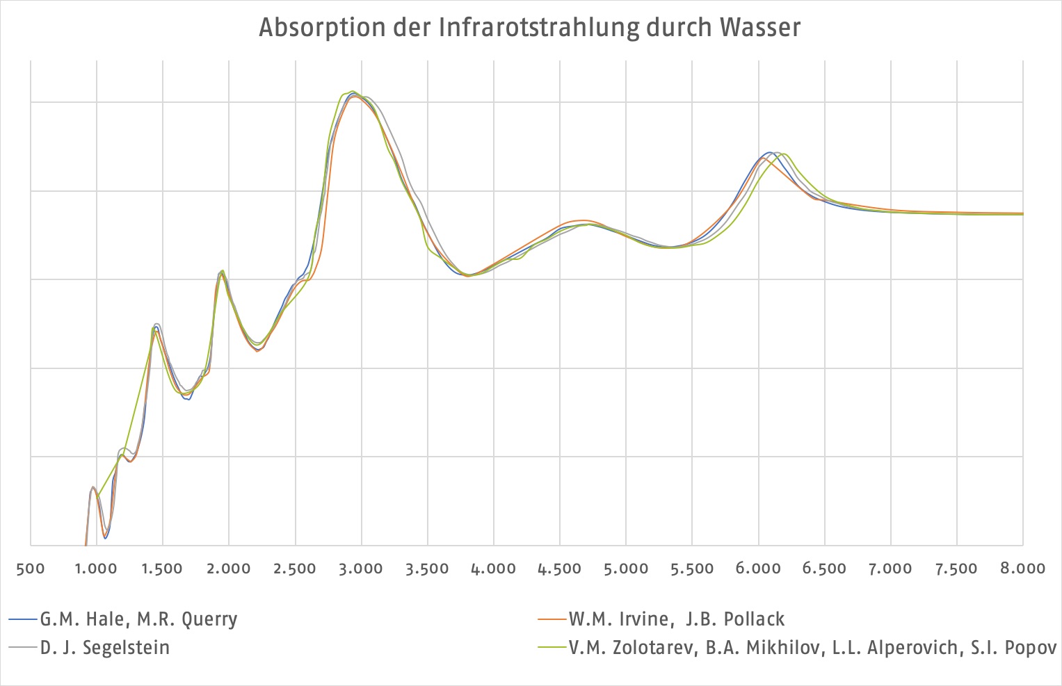 Hier die Absorptionskurven von Infrarot in Wasser in verschiedenen Aggregatzuständen. Im Nahinfraroten gibt es einen wesentlichen Peak bei 1,45 µm, bei dem Wasser Infrarotstrahlung absorbiert und in Wärme umsetzt. Hier werden die Wasserstoffbrückenbindungen besonders angeregt. Und diese sind für's Papiermachen entscheidend, sei es beim Trocknen von Strich, bei Profilieren des Papiers oder beim Vorwärmen: immer wollen wir Wasser entfernen, und dies können wir nur über die Trocknung. Gefriertrocknung schließt sich von selbst aus, also geht es nur über Kontakttrocknung (zwischen Zylinder und Papier), Konvektion (zwischen Dampf und Zylinderinnenseite oder Heißlufthauben und Papier) sowie Radiation - der Strahlung. Mikrowelle scheidet aus, es bleibt nur Infrarot. Die den Vorteil hat, wenn sie elektrisch erzeugt wird, dass sie tief eindringt, und Papier und Karton auch in z-Richtung gleichmässig erwärmt.